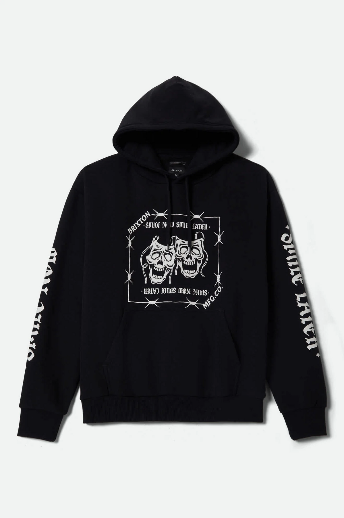 Relaxed hoodie with "smile now, smile later" sleeve graphics and worn wash comfort.