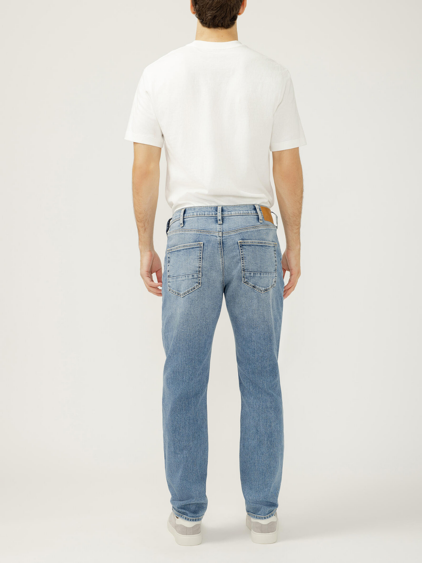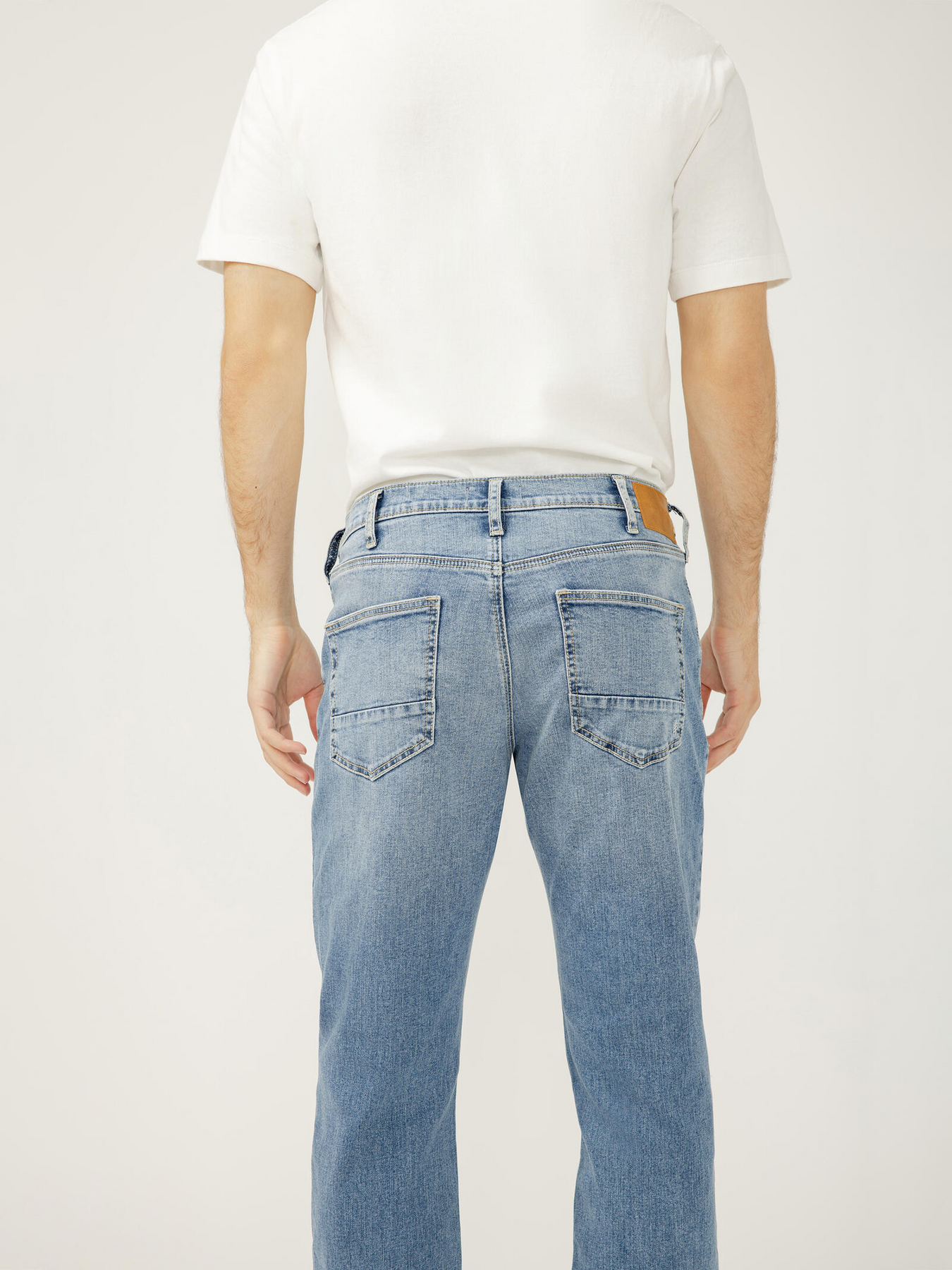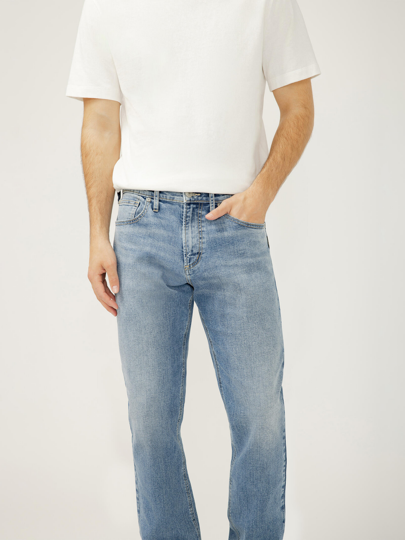 - Slim straight leg jeans in a light indigo wash